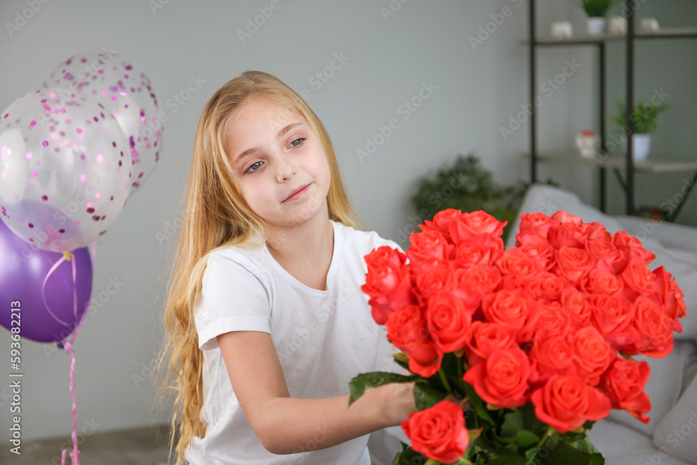 A girl with a smile gives a bouquet of flowers for Mother's Day.