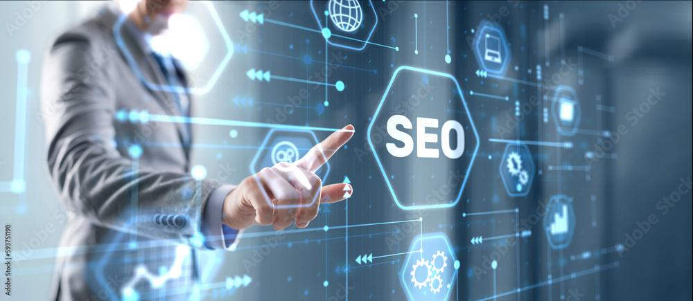 Businessman's fingers pressing a button SEO. Search engine optimization