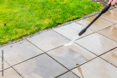 Detail of cleaning terrace with high-pressure water blaster, cleaning dirty paving stones