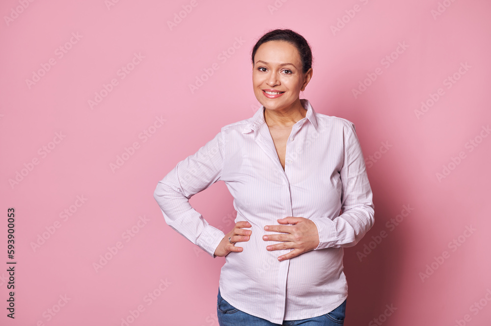 Attractive pregnant woman touching her belly, smiling with a beautiful toothy smile, enjoying her happy carefree pregnancy, expressing positive emotions, looking at camera, isolated on pink background