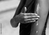 Close up of Black woman spreading sunscreen onto arm with pool background