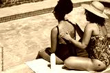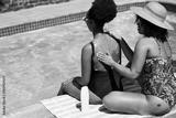 Woman applies sunscreen onto friend's back, sitting by pool wearing hat