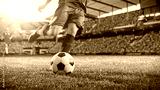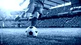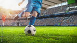 Football World Championship: Soccer Player Runs to Kick the Ball. Ball on the Grass Field of Arena, Full Stadium of Crowd Cheers. International Tournament Concept. Cinematic Shot Captures Victory.