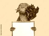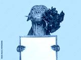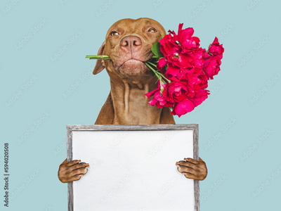 Lovable, pretty brown puppy, bouquet of flowers and empty board for your inscriptions. Closeup, indoors, studio photo. Congratulations for family, loved ones, relatives, friends and colleagues