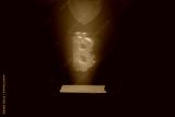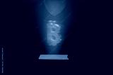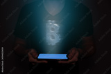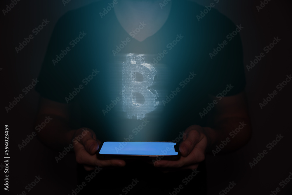A bitcoin is projected from a cellphone held by a man. Futuristic technology with AI.
