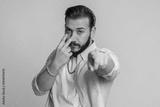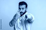 I am watching you. Young confident lebanese man pointing at his eyes and camera, show I am watching you gesture spying on someone. Handsome bearded arabian guy isolated alone on blue studio background