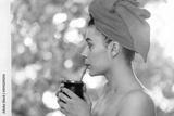 Woman drinking yerba mate after taking a shower in front of the window with a natural background of trees. Woman drinking yerba mate for breakfast at the beginning of the day. Diet with Yerba mate