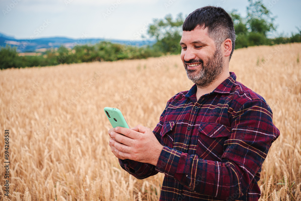 Happy mature farmer using cellphone device on a harvest wheat. Caucasian cowboy browsing on internet using a mobile phone app smiling and standing at grain growth. Agriculture worker typing with phone