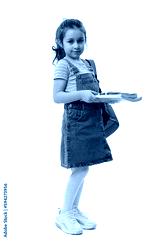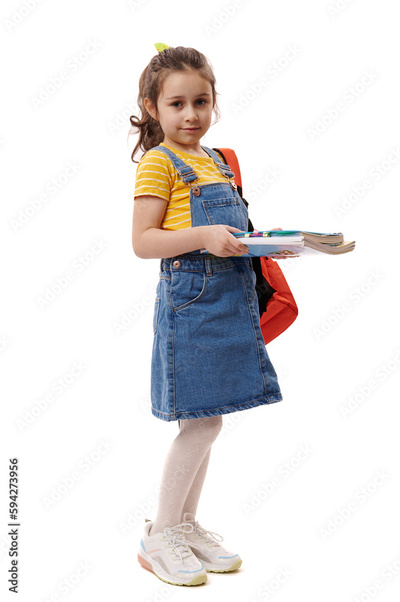 Full length portrait of Caucasian smiling excellent best student, first grader schoolgirl, 5-6 years old little girl holding books and copybooks going to school, isolated on white background. Ad space