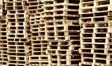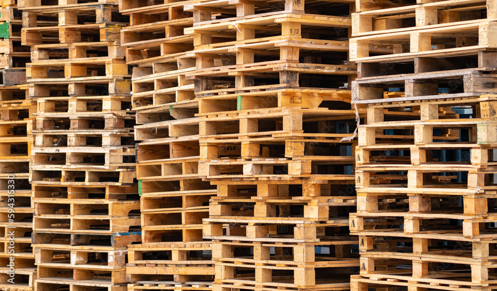 Stack of wooden pallet. Industrial wood pallet at factory warehouse. Cargo and shipping concept. Sustainability of supply chains. Eco-friendly nature and sustainable properties. Renewable wood pallet.