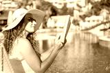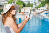 Young woman reading book in deck chair near swimming pool