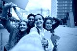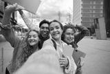 Smiling multiracial college students taking a selfie back to school. Happy friends photo together outside campus university holding folders. Cheerful classmates young people pose and amused.