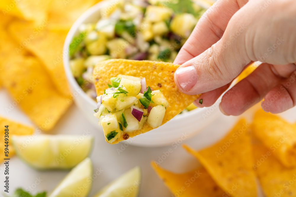 Fresh pineapple and jalapeno salsa in a bowl with tortilla chips