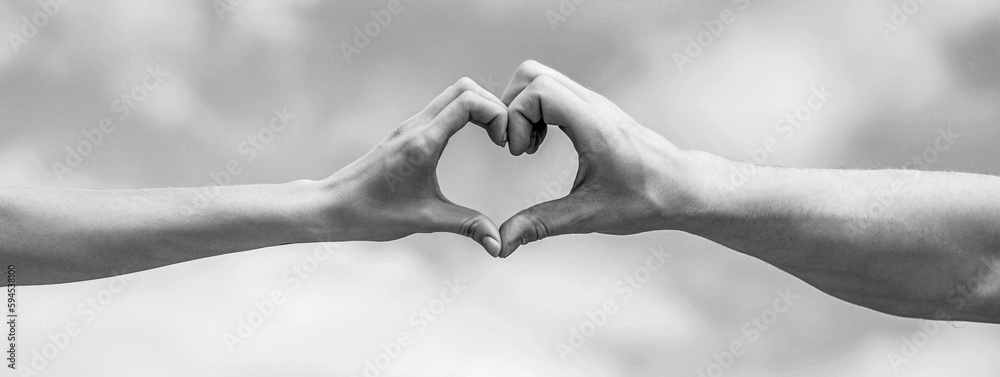 Love, friendship concept. Girl and male hand in heart form love blue sky. Black and white