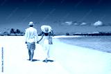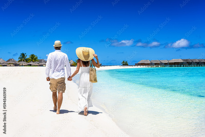 Happy couple in white summer clothing and with hats walks on a tropical paradise beach with turquoise sea in the Maldives islands
