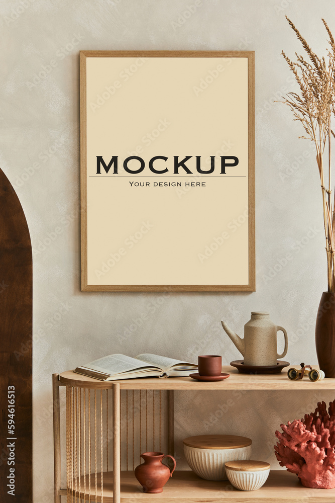 Minimalist composition of living room interior with brown wooden mock up, beige decoration, table lamp, furniture and personal accessories. Home decor. Template.
