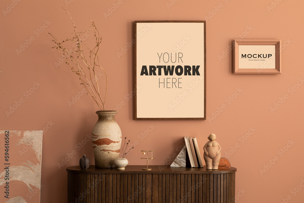 Aesthetic interior of living room with mock up poster frame, wooden commode, vase with dried flowers, sculpture in the shape of a woman, pink wall, books and personal accessories. Home decor. Template