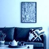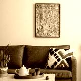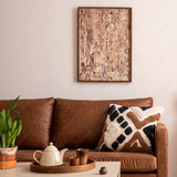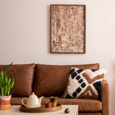 Creative composition of living room interior with brown sofa, mock up poster frame, beige coffee table, side table, plants and personal accessories. Stylish home decor. Template.
