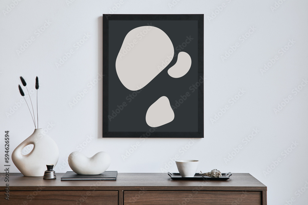 Minimalistic composition of creative living room interior with mock up poster frame and stylish small personal accessories on wooden commode. Copy space. Template. Real photo..