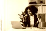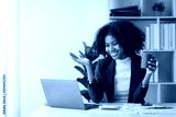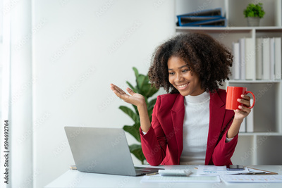 Elegant african american businesswoman in formal attire sitting with hot cup of coffee during break to relax and drinking anti-drowsy coffee while working on laptop recording meeting in office.