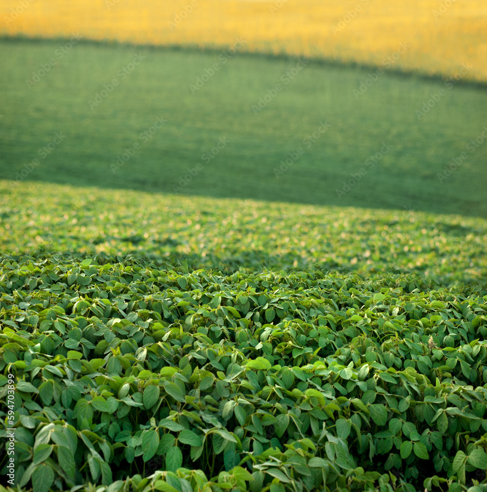 beautiful hill lines of green soybean field and yellow sunflower in the distance, rural landscape abstraction