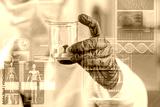 Futuristic Holographic Interface, showing medical Data in augmented reality from artificial intelligence AI. A hand in a medical glove holding a jar of pills