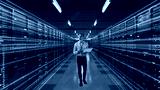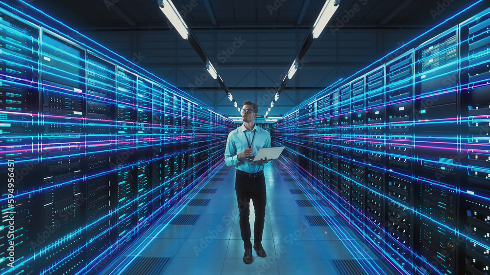 Futuristic Concept: Data Center Chief Technology Officer Holding Laptop, Standing In Warehouse, Information Digitalization Lines Streaming Through Servers. SAAS, Cloud Computing, Online Service