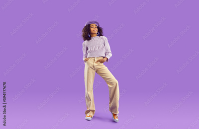 Kid model in stylish fit posing in studio. Full body length beautiful African girl wearing beret hat, blouse and beige wide leg jeans standing on purple background. Clothing, childrens fashion concept