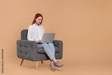 Smiling young woman working with laptop in armchair against beige background, space for text
