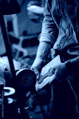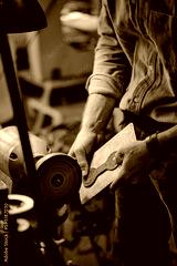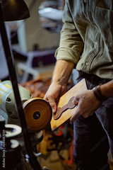 young man concentrated on working on electric burnishing tool. side view cropped portrait. amazing leather work, hobby, lifestyle, occupation, past time