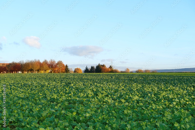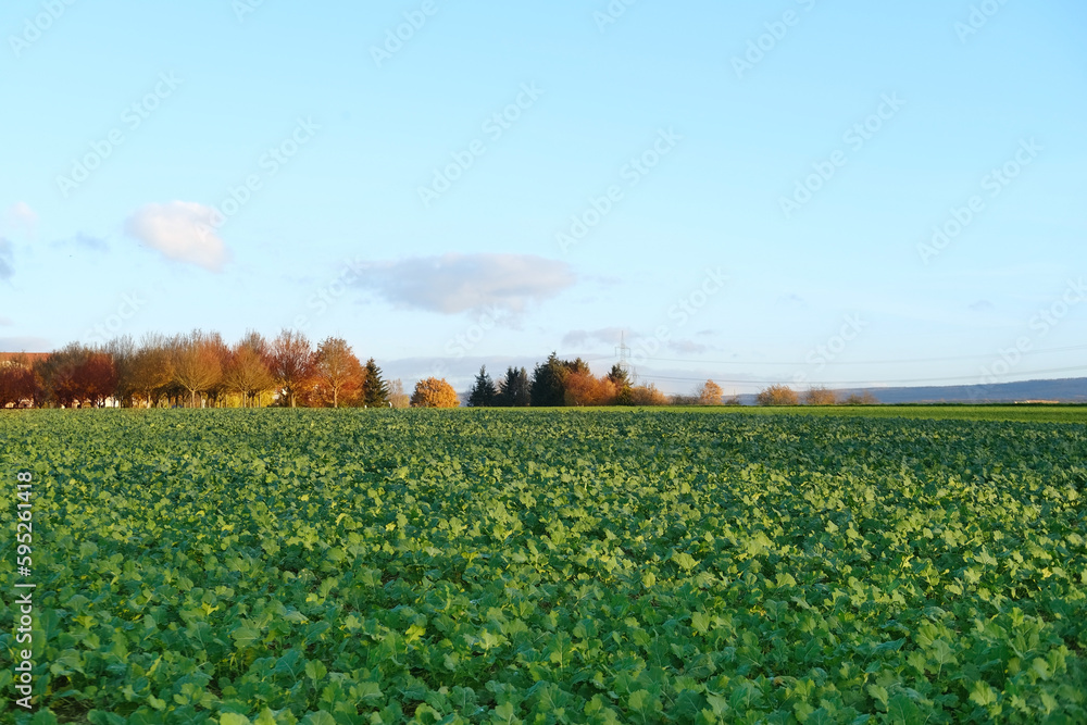 autumn field with green plants of winter rapeseed on big agriculture field , young green rapeseed field, background, texture from young plants_ work in agronomic farm and production organic food