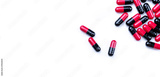 Top view red-black antibiotic capsule pills on white background. Prescription drug. Antibiotic drug. Pharmaceutical industry. Antimicrobial pills for treatment infections. Healthcare and medicine.