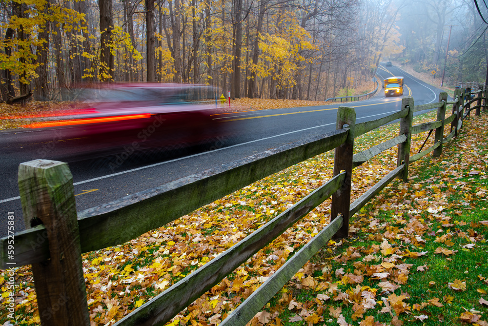 Slow motion light trails from moving cars along country road with rustic wooden fence, colorful fall foliage leaves carpet foggy early morning in Rochester, New York, USA
