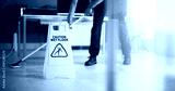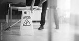 Male Janitor Cleaning Floor With Caution Wet Floor Sign