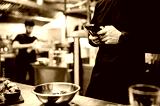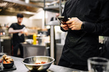 chef with phone in hands on restaurant kitchen