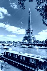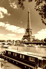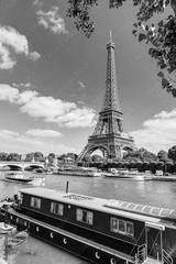 Barge on Seine River overlooking Eiffel Tower, Paris, France
