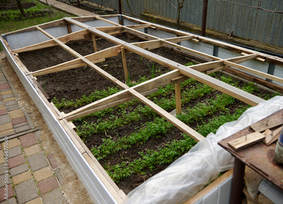 Top view of parsley, dill and herbs growing outdoors on a seed bed in greenhouse conditions. Protection of growing greenery with a film from cold and wind. Agriculture. Gardening. Agricultural hobby