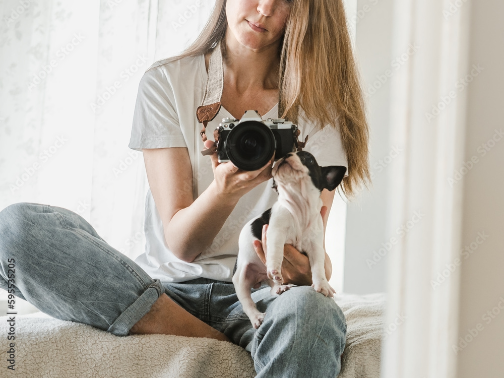 Cute puppy and a young woman with a camera. Clear, sunny day. Close-up, indoors. Studio photo. Day light. Concept of care, education, obedience training and raising pet