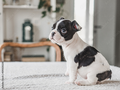 Cute puppy sitting on the table. Clear, sunny day. Close-up, indoors. Studio photo. Day light. Concept of care, education, obedience training and raising pets