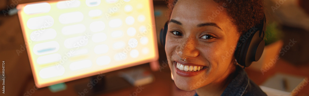 Afro american woman graphic designer drinking tea during break at home office. Freelance concept