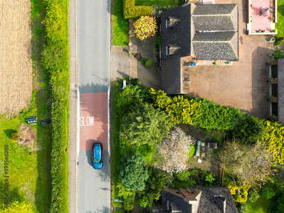Drone top down view of a Slow road markings seen on a dangerous rural English road. A single car passes at speed.