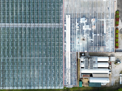 Drone view of a huge commercial glass house growing commercial plants. Storage tanks and support buildings can be seen.