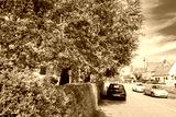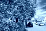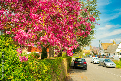 Shallow focus of a wonderful purple tree seen in a rural village in East Anglia. A public house is seen on the right, near the village green.