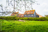 Shallow focus of springtime twigs seen on an acorn tree on common land. Beyond are large new build semi detached houses in a village location.