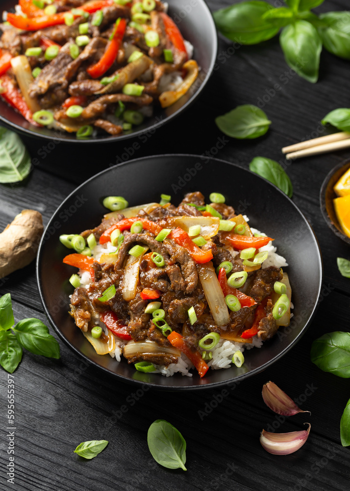 Stir fry Crispy Orange Beef with sweet peppers, onion and rice. Asian food