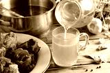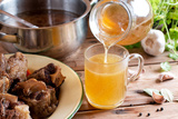 Glass jar with yellow fresh bone broth o on wooden table. Healthy low-calories food is rich in vitamins, collagen and anti-inflammatory amino acids