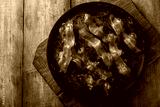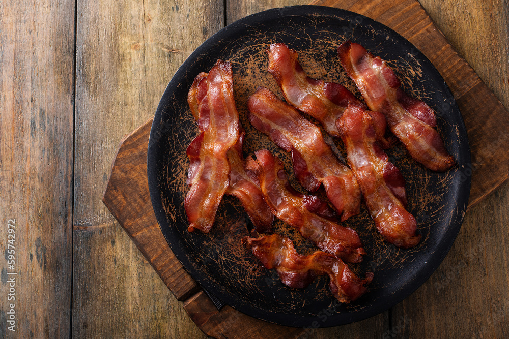 Cooked bacon on a wooden serving plate