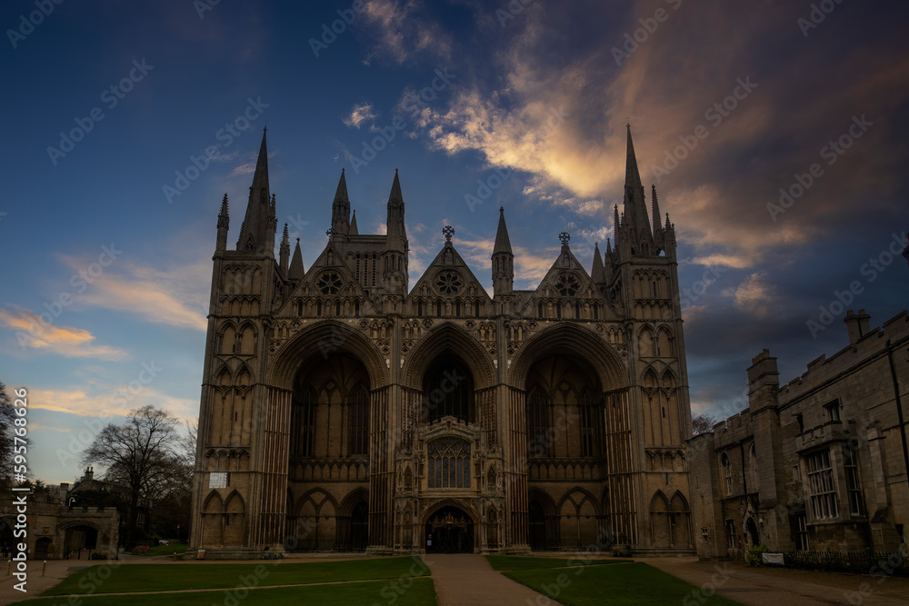 Sunset over the Cathedral Church of St Peter, St Paul and St Andrew in Peterborough, Cambridgeshire, UK