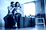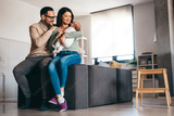 Proud mother and father smiling at their newborn baby daughter, son at home