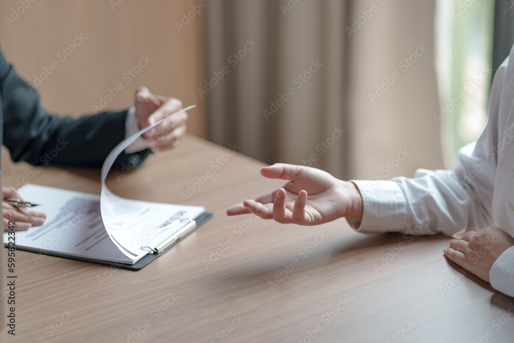 Successful job interview, Recruiter or manager and job candidate with resume in office..